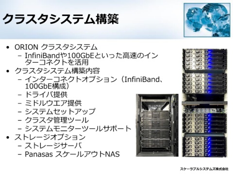 クラスタシステム構築 • ORION クラスタシステム – InfiniBandや100GbEといった高速のイン ターコネクトを活用 • クラスタシステム構築内容 – インターコネクトオプション(InfiniBand、 100GbE構成) – ドライバ提供 – ミドルウエア提供 – システムセットアップ – クラスタ管理ツール – システムモニターツールサポート • ストレージオプション – ストレージサーバ – Panasas スケールアウトNAS スケーラブルシステムズ株式会社