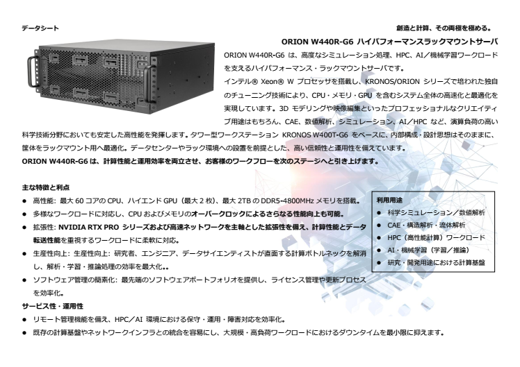 ORION W450R は、タワー型ワークステーション KRONOS W400T-G6 で培われた内部構成・チューニング技術・設計思想を継承し、筐体をラックマウント用に最適化したモデルです。ワークステーション由来の高い計算性能を維持しながら、データセンターやサーバールームでの運用に適した信頼性・保守性・設置性を備えています。
