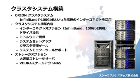 クラスタシステム構築 • ORION クラスタシステム – InfiniBandや100GbEといった高速のインターコネクトを活用 • クラスタシステム構築内容 – インターコネクトオプション(InfiniBand、100GbE構成) – ドライバ提供 – ミドルウエア提供 – システムセットアップ – クラスタ管理ツール – システムモニターツールサポート • ストレージオプション – 大容量ストレージサーバ – VDURAスケールアウトNAS スケーラブルシステムズ株式会社