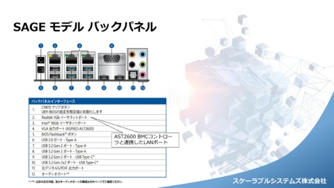 SAGE モデル バックパネル AST2600 BMCコントロー ラと連携したLANポート スケーラブルシステムズ株式会社 スケーラブルシステムズ株式会社