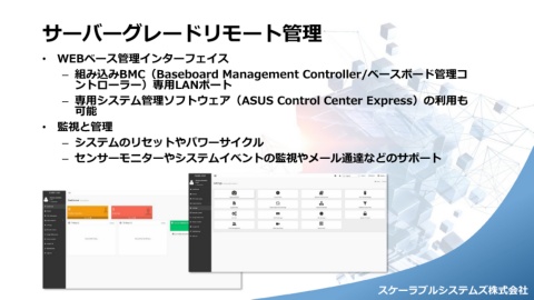 サーバーグレードリモート管理 • WEBベース管理インターフェイス – 組み込みBMC(Baseboard Management Controller/ベースボード管理コ ントローラー)専用LANポート – 専用システム管理ソフトウェア(ASUS Control Center Express)の利用も 可能 • 監視と管理 – システムのリセットやパワーサイクル – センサーモニターやシステムイベントの監視やメール通達などのサポート スケーラブルシステムズ株式会社