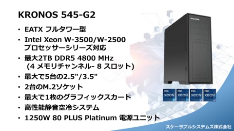 KRONOS 545-G2 • EATX フルタワー型 • Intel Xeon W-3500/W-2500 プロセッサーシリーズ対応 • 最大2TB DDR5 4800 MHz (4 メモリチャンネル- 8 スロット) • 最大で5台の2.5"/3.5" • 2台のM.2ソケット • 最大で1枚のグラフィックスカード • 高性能静音空冷システム • 1250W 80 PLUS Platinum 電源ユニット スケーラブルシステムズ株式会社