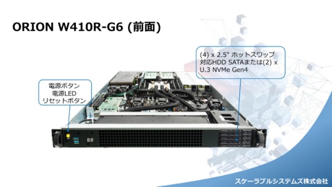 ORION W410R-G6 (前面) (4) x 2.5" ホットスワップ 対応HDD SATAまたは(2) x U.3 NVMe Gen4 電源ボタン 電源LED リセットボタン スケーラブルシステムズ株式会社