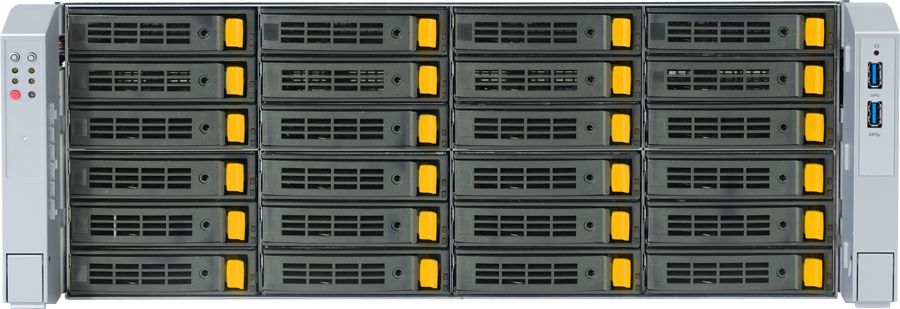 (24) 3.5”/ 2.5” NVMe/SATA/SAS ホットスワップ HDD/SSD (前面) +